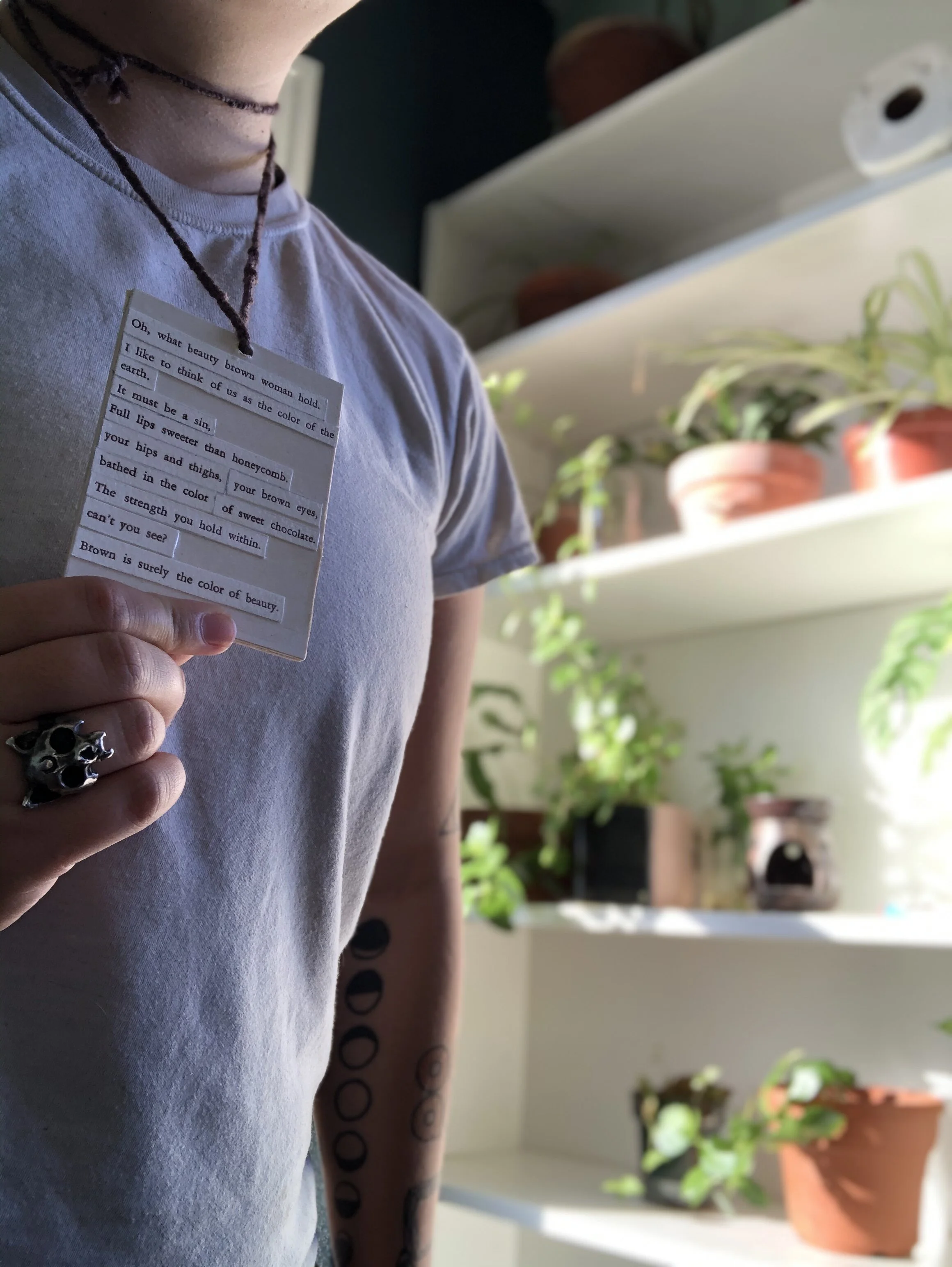 I have cut and reassembled the words from this poem by Terra in order to recontextualize a new interpretation. My interpretation. Poetry in my practice has allowed me to show my unique perspective of life. telling a story the use of text is a way that I express my emotion as an act of resistance.